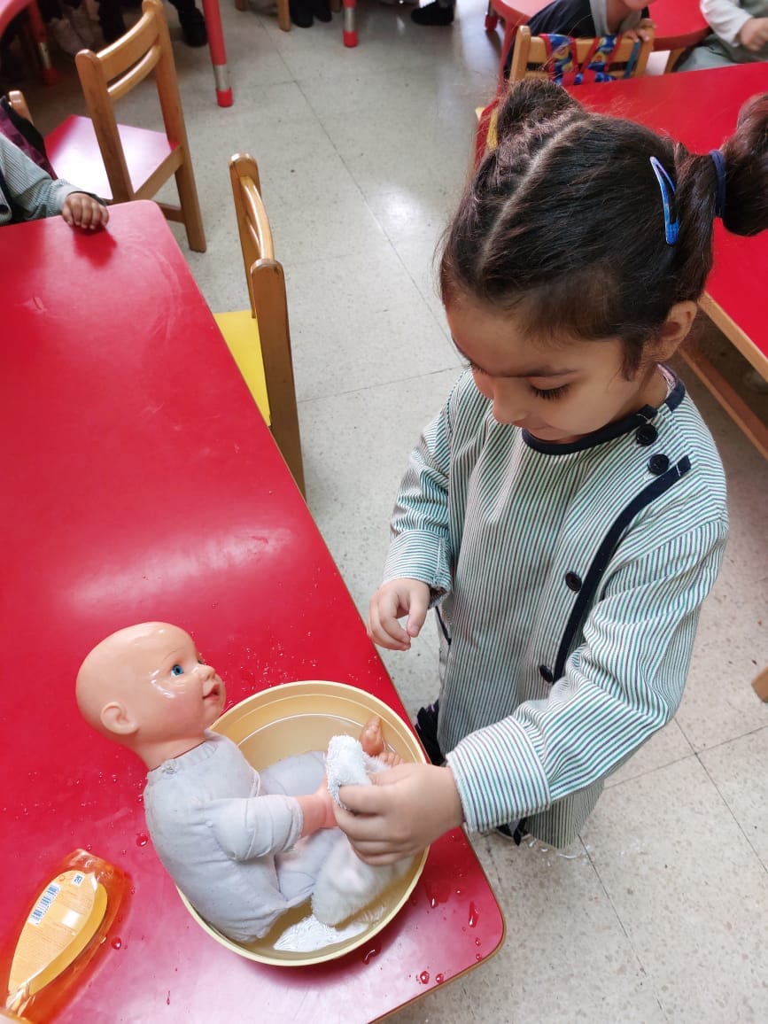 KG1 students helped the baby doll to take a bath in order to be clean.