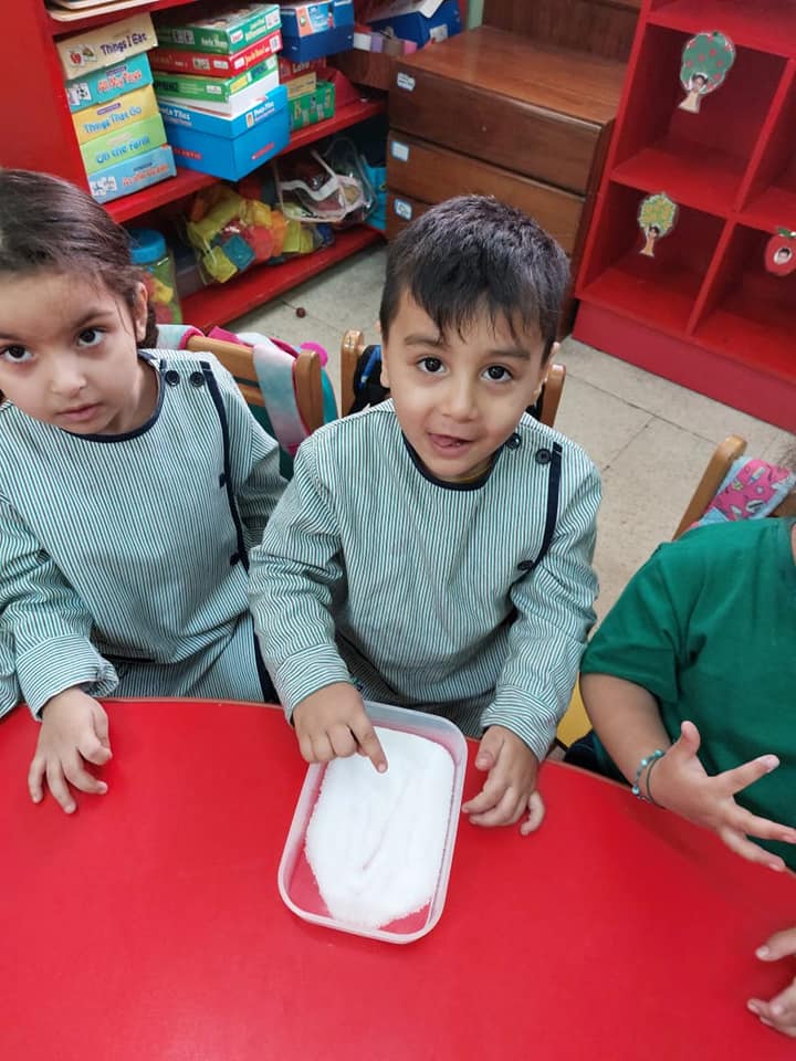 Drawing lines is very important, it will help KG1 students to draw and trace sounds and numbers later on. We started the lesson by drawing vertical lines in the salt box.